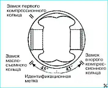 - - Расположить замки поршневых колец так, как показано на рисунке.