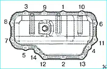 - - Установить нижний масляный поддон на верхний масляный поддон и зафиксировать его при помощи четырнадцати болтов с шестигранными головками (М6х12). Затянуть крепежные болты рекомендуемым моментом затяжки в порядке, указанном на рисунке. Момент затяжки: 9 Нм ± 3 Нм.