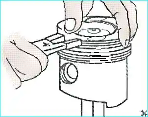- - Вставить поршень и шатун в сборе в цилиндр с верхней стороны таким образом, чтобы стрелка на днище поршня была направлена к передней части двигателя. Сжать поршневые кольца при помощи приспособления для сжатия колец, затем вставить поршень с шатуном в цилиндр.