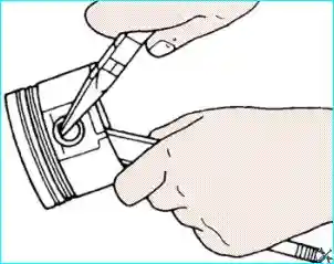 - - Извлечь стопорное кольцо поршневого пальца из установочного паза при помощи острогубцев.
