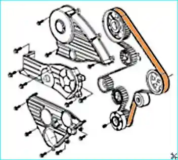 - - Отвернуть десять крепежных болтов с шестигранной головкой (M6×16, M10×35 и М10х50) и снять кожухи ремня привода ГРМ.