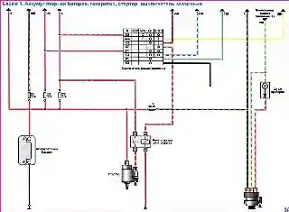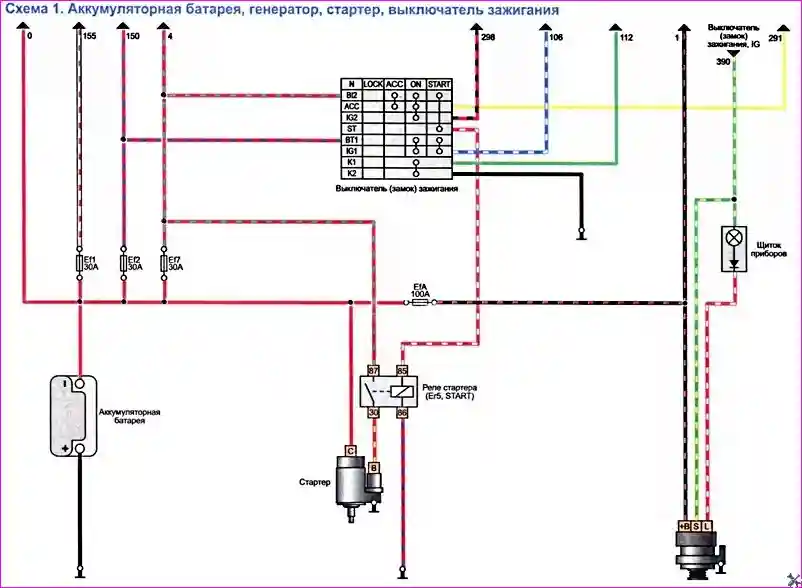 Схема 1. Аккумуляторная батарея, генератор, стартер, выключатель зажигания