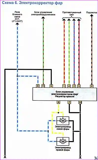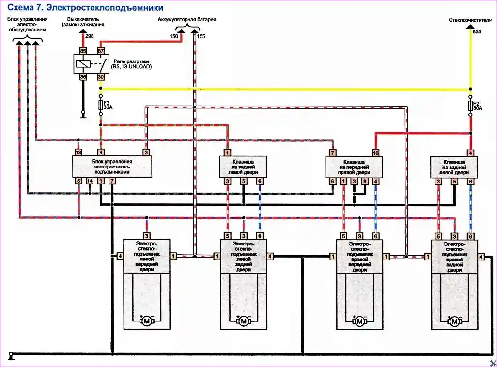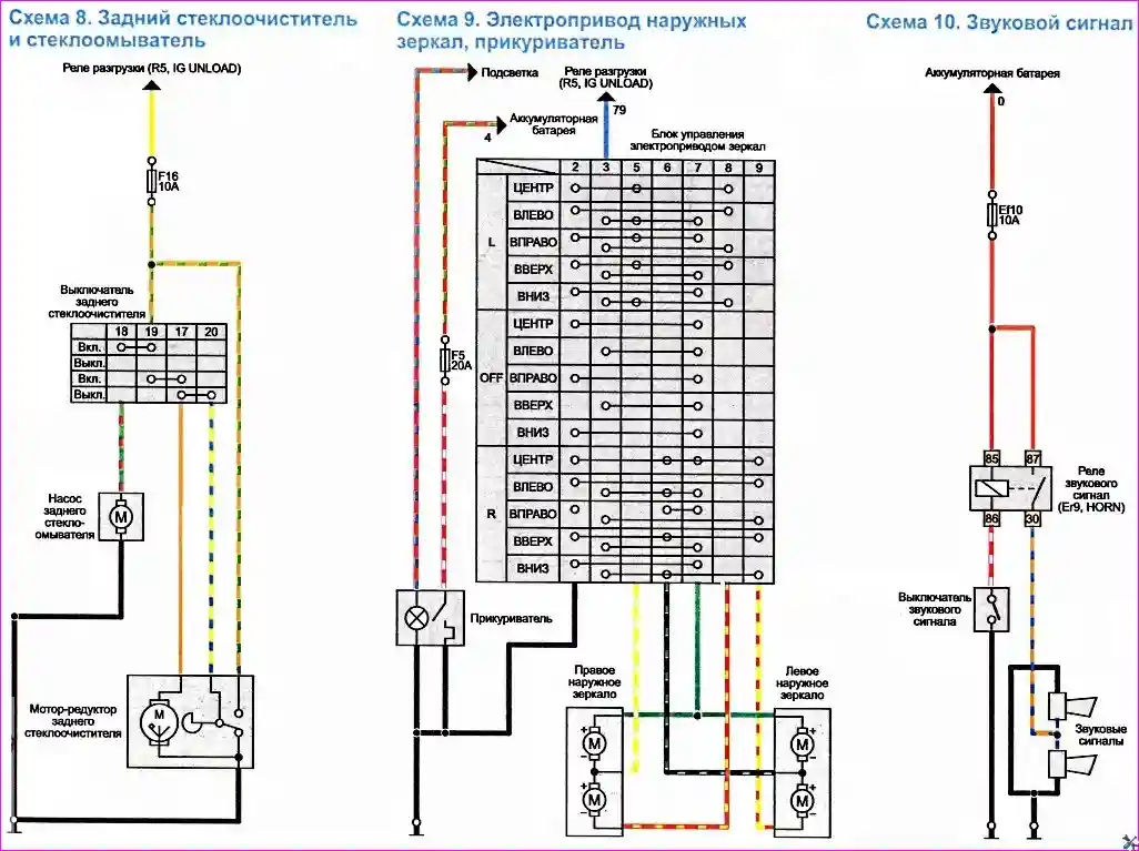 Схема 8, 9, 10. Задний стеклоочиститель и стеклоомыватель, электропривод наружных зеркал, прикуриватель, звуковой сигнал