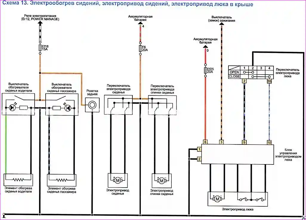 Схема 13. Электрообогрев сидений, электропривод сидений, электропривод люка в крыше