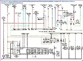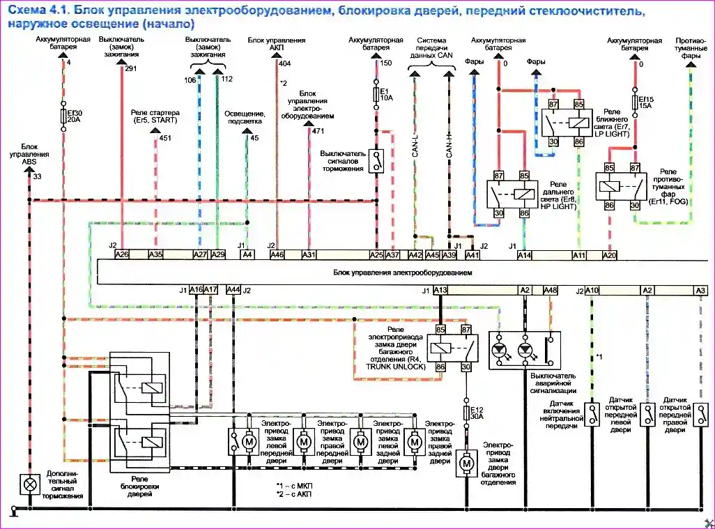 Схема 4.1. Блок управления электрооборудованием, блокировка дверей, передний стеклоочиститель, наружное освещение (начало)
