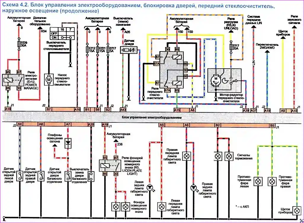 Схема 4.2. Блок управления электрооборудованием, блокировка дверей, передний стеклоочиститель, наружное освещение (продолжение)