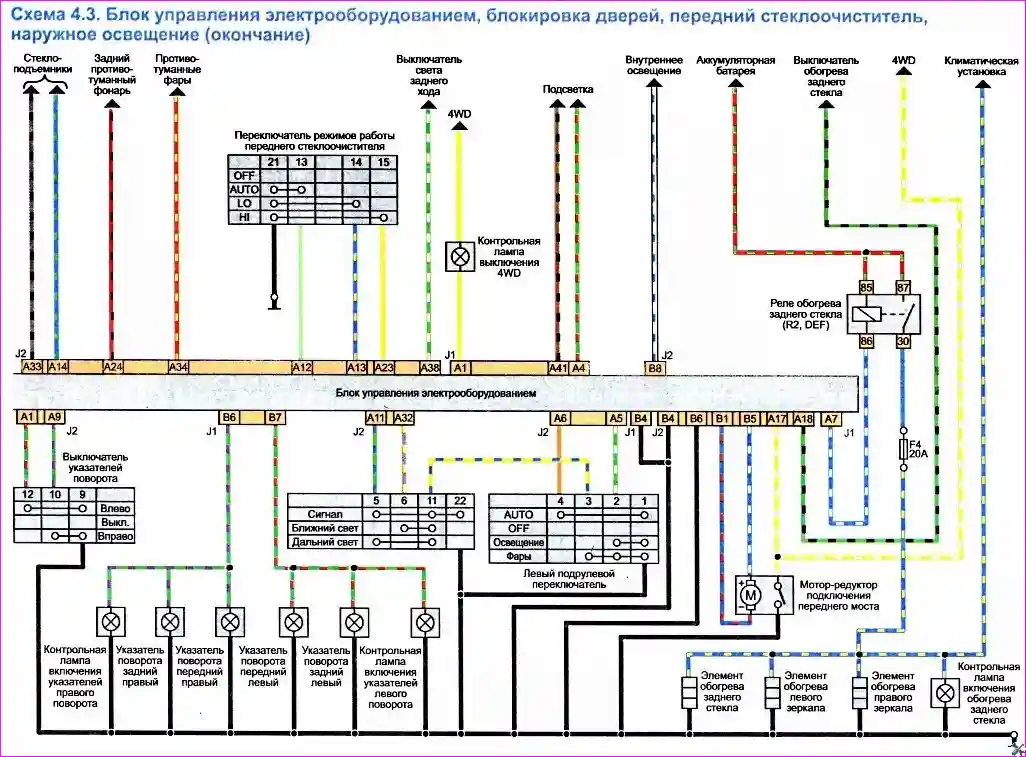 Схема 4.3. Блок управления электрооборудованием, блокировка дверей, передний стеклоочиститель, наружное освещение (окончание)