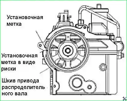 Повернуть зубчатое колесо коленчатого вала до тех пор, пока метка на зубчатом колесе совместится со стрелкой на корпусе масляного насоса.