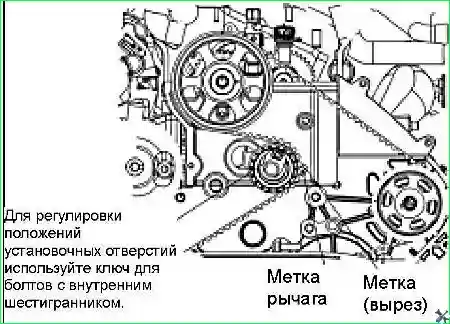 Установить натяжной шкив ремня привода ГРМ. Для этого, зафиксировать ограничительный кронштейн натяжного шкива ремня привода ГРМ в месте, где в головке блока цилиндров установлена круглая заглушка. Повернуть натяжной шкив при помощи шестигранного торцового гаечного ключа таким образом, чтобы монтажный штифт совместился с пазом, и затем затянуть болт крепления натяжного шкива рекомендуемым моментом затяжки. Момент затяжки: 22-26 Нм.