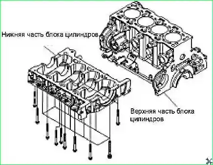 • - Отвернуть одиннадцать болтов с шестигранной головкой (М8х80) крепления нижнего блока цилиндров к верхнему блоку цилиндров.