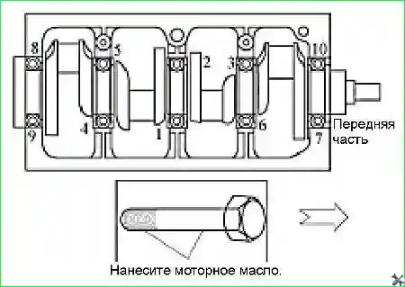 • - Отвернуть десять болтов крепления крышек коренных подшипников.