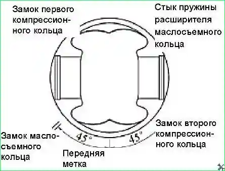 Расположить замки поршневых колец так, как показано на рисунке.