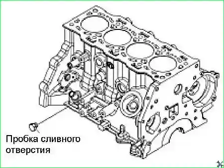 • - Отвернуть сливную пробку системы охлаждения из блока цилиндров, снять датчик положения коленчатого вала и датчик давления моторного масла.