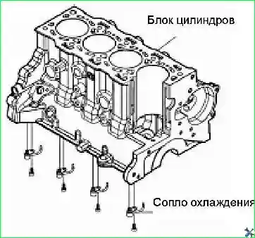 • - Отвернуть четыре винта (М6х12) и снять масляные форсунки с верхнего блока цилиндров двигателя.