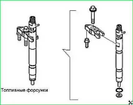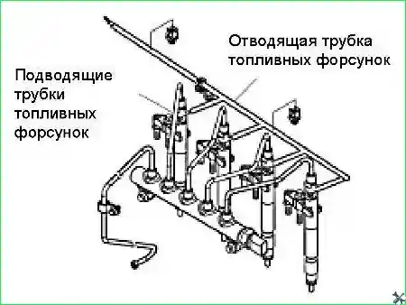 - - Отвернуть соединительные гайки и снять впускные топливопроводы топливных форсунок