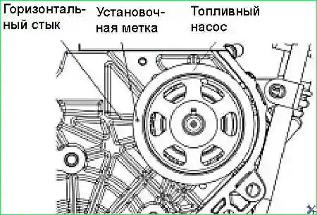 - - Совместить метку для установки фаз газораспределения на шкиве топливного насоса с горизонтальной полоской на корпусе водяного насоса, как показано на рисунке.