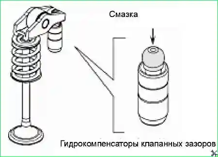 - - Нанести смазочное масло на шаровую головку гидрокомпенсатора и затем установить его внутрь зажима в задней части коромысла клапана.