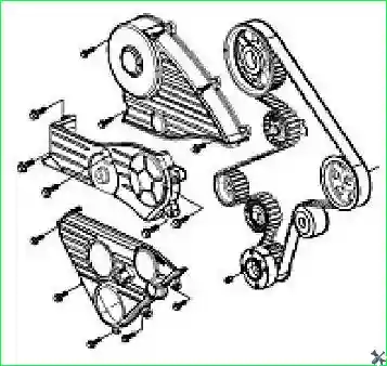 - - Отвернуть десять крепежных болтов с шестигранной головкой (М6х16, М10х35 и М10х50) и снять кожухи ремня привода ГРМ