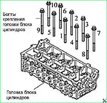 - - Равномерно ослабить и отвернуть десять болтов (М11х1,5х162) крепления головки блока цилиндров к блоку цилиндров.