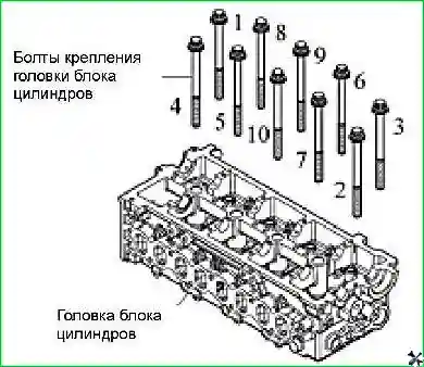 Перед установкой, необходимо проверить техническое состояние болтов крепления головки блока цилиндров двигателя. При необходимости, заменить болты крепления головки блока цилиндров.