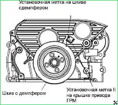- - Совместить метку для установки фаз газораспределения на демпфирующем шкиве с меткой для установки фаз газораспределения кожуха №2 ремня привода ГРМ, как показано на рисунке.