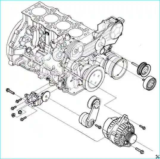 - - Отвернуть крепежные болты и снять промежуточный ролик приводного ремня.