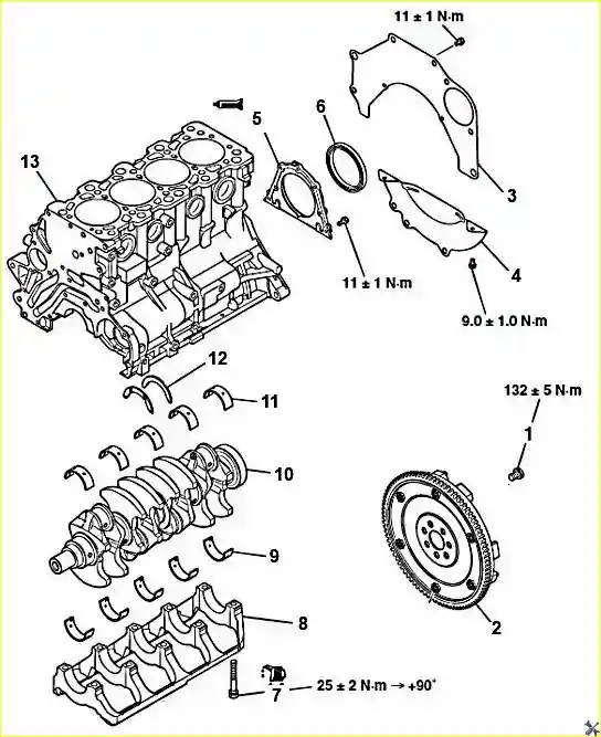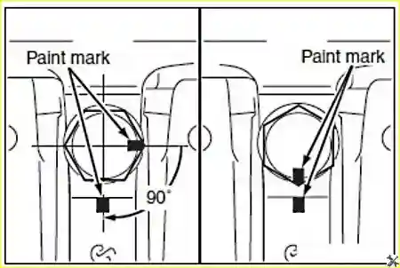 Примечание: Если болты будут дотянуты менее чем на 90°, то корпус крышек коренных подшипников будет зафиксирован недостаточно надежно. Если болты будут затянуты более чем на 100°, то необходимо отвернуть их и затянуть повторно.