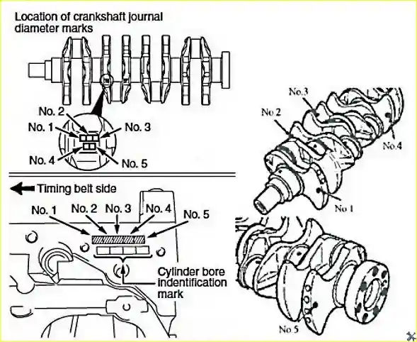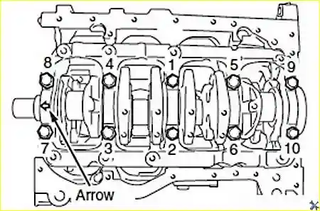 Примечание: Идентификационная стрелка корпуса крышек коренных подшипников должна быть направлена в сторону зубчатого ремня привода ГРМ.