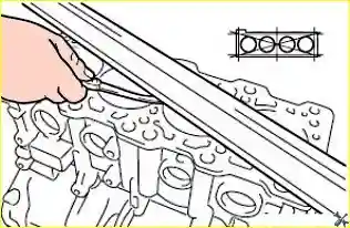 - 2) Поместить калиброванную проволоку «Plastigage» вдоль каждой коренной шейки коленчатого вала.