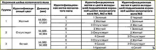 1) Подобрать вкладыши коренных подшипников в соответствии с таблицей.