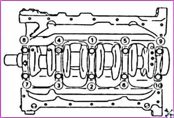 Отверните по два болта крепления пяти крышек коренных подшипников.