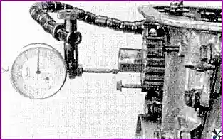 Сдвиньте коленчатый вал до упора от индикатора и установите стрелку индикатора на (0). Сдвиньте вал в обратную сторону. Индикатор покажет величину зазора. Номинальный осевой зазор коленчатого вала равен 0,05-0,18 мм, предельно допустимый - 0,25 мм.