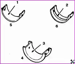 Установите вкладыши коренных подшипников в постели блока цилиндров в соответствии с метками, сделанными при разборке. Обратите внимание, что вкладыши устанавливаются согласно рис. 6. При установке вкладышей их стопорные усики должны войти в пазы постелей. Смажьте вкладыши моторным маслом.