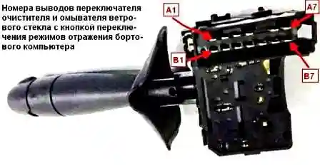 Замыкание контактов при различных положениях рычага переключателя очистителя и омывателя ветрового стекла с кнопкой переключения режимов отображения бортового компьютера