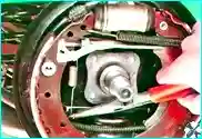 При минимально допустимой толщине фрикционных накладок тормозных колодок размер, измеренный по диаметру колодок, установленных в тормозной механизм с приведенным в исходное состояние регулятором зазоров, составляет 179,4 мм для автомобиля с двигателем рабочим объемом 1,4 л и 202,45 мм для автомобиля с двигателем рабочим объемом 1,6 л