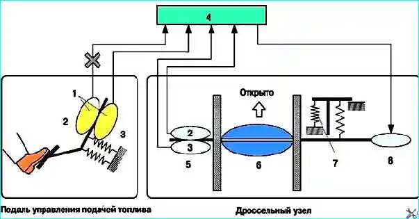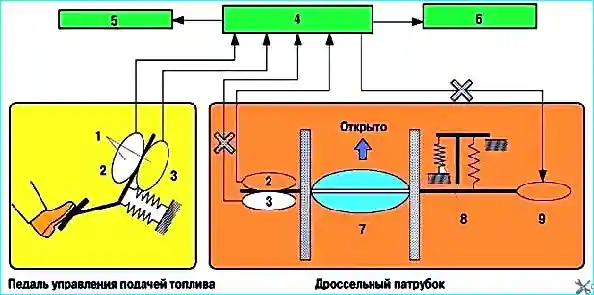 Аналогичный алгоритм управления используется, если электронный блок управления двигателя обнаруживает неисправность в системе электродвигателя привода дроссельной заслонки.