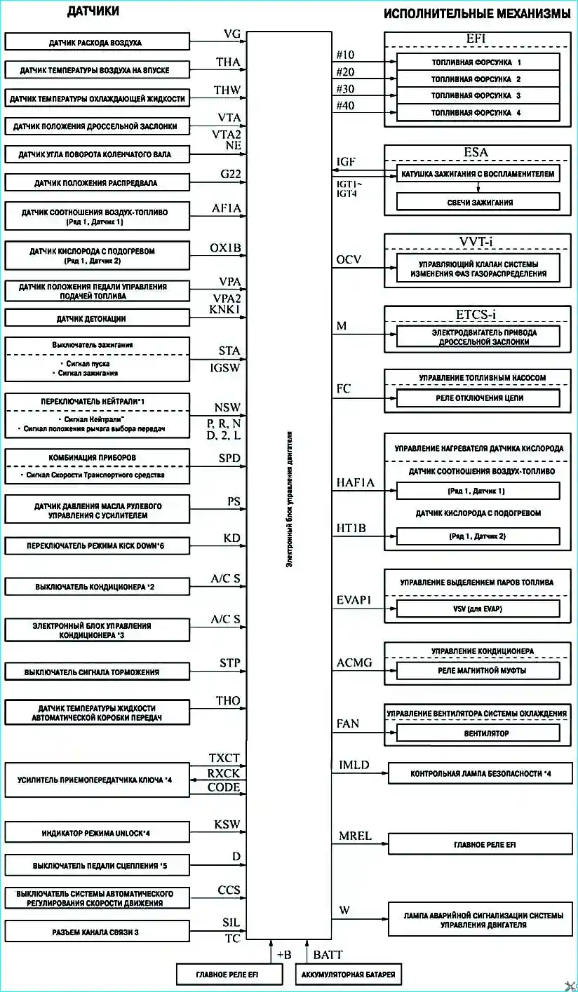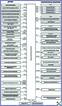 Контроллер управляет исполнительными механизмами, такими как топливные форсунки, дроссельный патрубок с электроприводом, катушка зажигания, нагреватель датчика кислорода, клапан продувки адсорбера и различными реле.