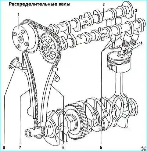 Распредвалы приводятся во вращение роликовой цепью с шагом 8 мм