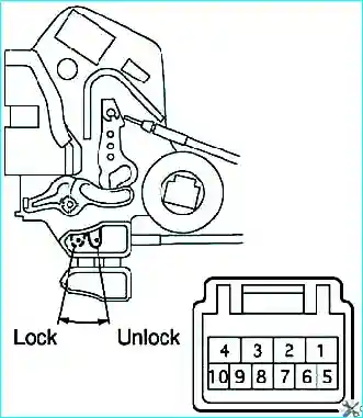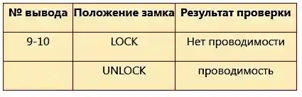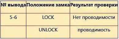 Проверьте наличие проводимости сигнала между выводами разъема и выключателя замка двери со стороны водителя в положениях, указанных в таблице.