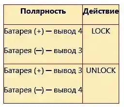 Соедините положительную клемму аккумуляторной батареи с выводом «2» и отрицательную клемму – с выводом «1», убедитесь, что защелка замка перешла в положение «LOCK»