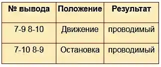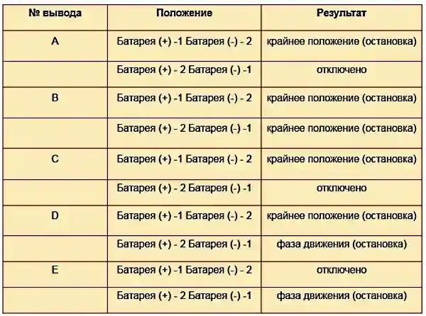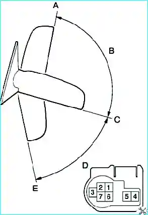 Подключите аккумуляторную батарею к выводам разъема электродвигателя, проверьте сигнал, изменяя положение зеркала согласно данным в таблице.