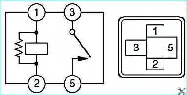 Проверьте наличие проводимости между выводами «1» и «2» реле при приложении напряжения аккумуляторной батареи между выводами «3» и «5».
