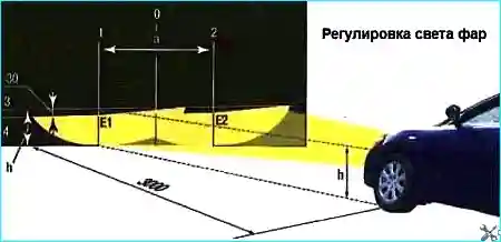 Фары считаются отрегулированными, когда верхние границы левых частей световых пятен совпадают с линией 4, а вертикальные линии 1 и 2 проходят через точки (Е1) и (Е2) пересечения горизонтальных и наклонных участков световых пятен
