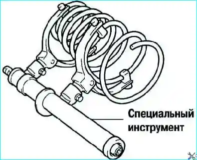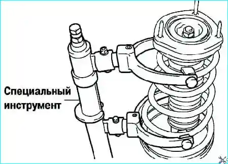 Используя специальный инструмент, сожмите пружину и установите ее на стойку (рис. 11).