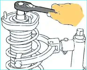 Окончательно открутите центральную гайку крепления верхней опоры стойки и снимите опору стойки.