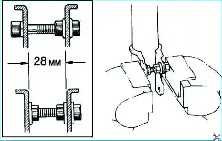 Установите болт и две гайки на нижний кронштейн стойки амортизатора и закрепите стойку в тисках (рис. 7)