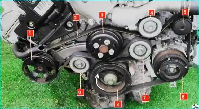 Вспомогательные агрегаты: генератор, водяной насос, насос ГУР и компрессор кондиционера двигателя 2GR-FE приводятся поликлиновым ремнем