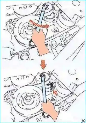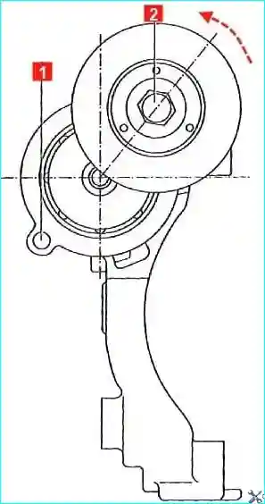 Надев ключ на шестигранник 2 оси ролика натяжителя, поворачиваем рычаг натяжителя в направлении, указанном стрелкой, до совмещения отверстия 1 в рычаге с отверстием в кронштейне натяжителя
