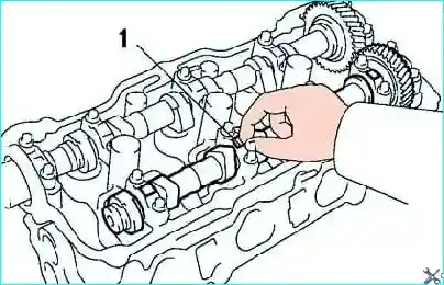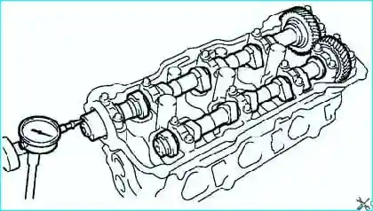 Индикатором измерьте осевой зазор при перемещении распределительных валов назад и вперед (рис. 1)