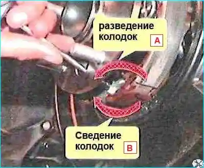 Разводим верхние концы колодок и снимаем распорную планку «А» с установленной на ней распорной пружиной